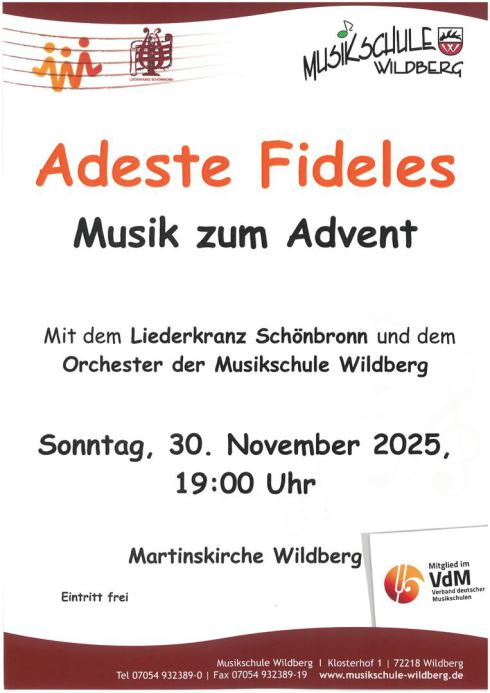 Zum Ausklang des Wildberger Weihnachtsmarktes gestaltet der gemischte Chor das traditionelle Konzert "Adeste Fideles" der Musikschule Wildberg in der Wildberger Stadtkirche mit.